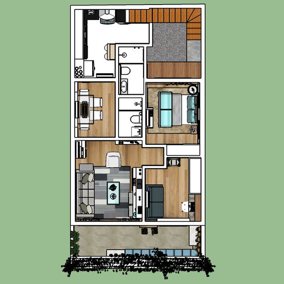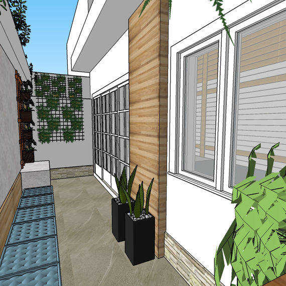 Idealizamos também um pequeno pátio reservado onde o único acesso se dá pela a suite do casal e pela a cozinha.